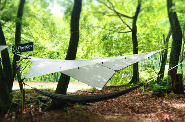 こちらは「PAAGO WORKS ニンジャタープ」。手裏剣型のシルエットで21か所のジョイントポイントで様々な形状で張れ、タープ同士の連結も容易。もちろんハンモックのタープとしても優秀で、前後2辺に内蔵されたドローコードを引くことで、キレイなシルエットを出していた。
