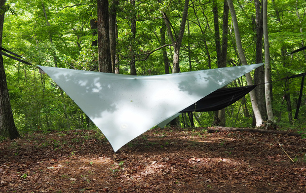こちらは超軽量ハンモックで一躍有名になった「Hummingbird Hammocks ヘロンタープ」。240g台と軽量ながら4か所のポイントで、タープ中央から吊ったり、内側にすることでランタンなどの荷物を吊るすことができるとの事。