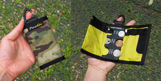 PAAGO WORKS『トレイルバンクS』の特徴は三つ折りサイズと三角クリップで特定の場所にクリップできること。ボクはネットで購入した『コインホーム』を取り付け小銭の管理もできるようにした。掌にすっぽりと収まるサイズ感がよく、山用に作ったが日常の買物にも使っている。主に街と緩い低山で使用中だ。