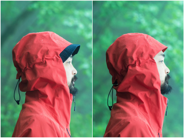 そのまま着用した場合と、キャップの上から着用した場合のフード形状比較。しっかりとしたひさしが付くので、キャップなしでもしっかり雨を防ぐ