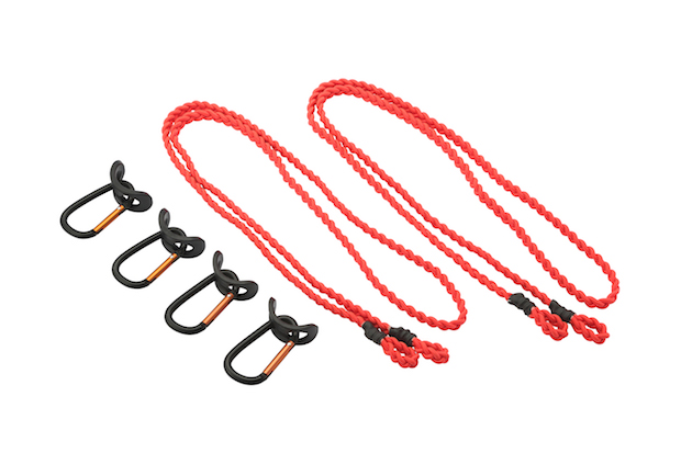 長さ:120㎝ 抗張力:90㎏ カラー:オレンジ、ブラック 内容:バンジーコード×2、パックタック×4、アルミカラビナ×4 価格:4200円+税