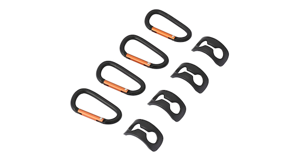 サイズ:7.6㎝ 耐荷重:45㎏ 内容:パックタック大×4、アルミカラビナ大×4 価格;2800円+税