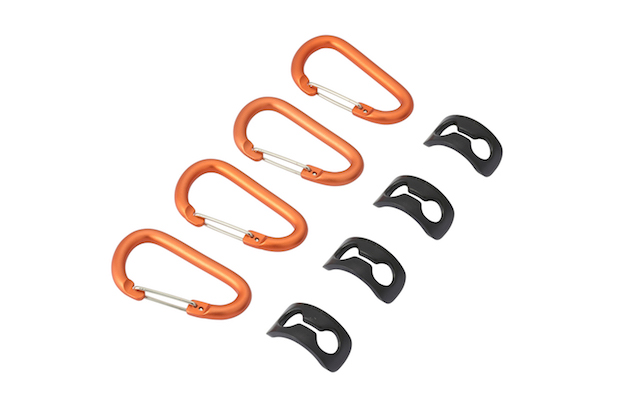 パックタックをタープやフライシートの生地に当てて、アルミカラビナで挟むように押し込むことで生地をホールド。支点として活用できる。サイズ:6.3㎝ 耐荷重:18㎏ 内容:パックタック×4、アルミカラビナ×4 価格;1800円+税