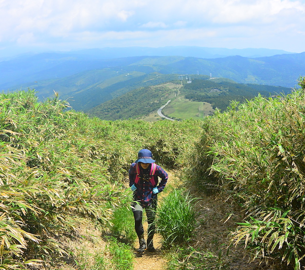 しばらく、ササ原の中のきれいに刈り払いされた道を歩いて行くと、展望が開けてきます。しかし、登山道をよく見てみると、鋭角な切り口がむき出しの根元があります。ソールがやわらく、薄い靴だと思わず踏み抜いてしまいそうで怖いのですが、このソールとアッパーであればガシガシと歩けるのでとても安心です。