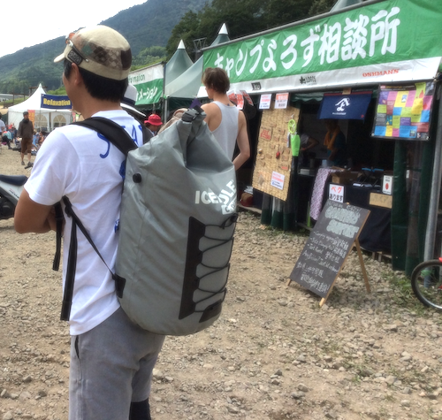 2016年のフジロック/キャンプサイト、キャンプよろず相談所の前にて。見た目はふつうの防水バッグですよね、バックパックタイプの。でもこれは、れっきとしたソフトクーラーです