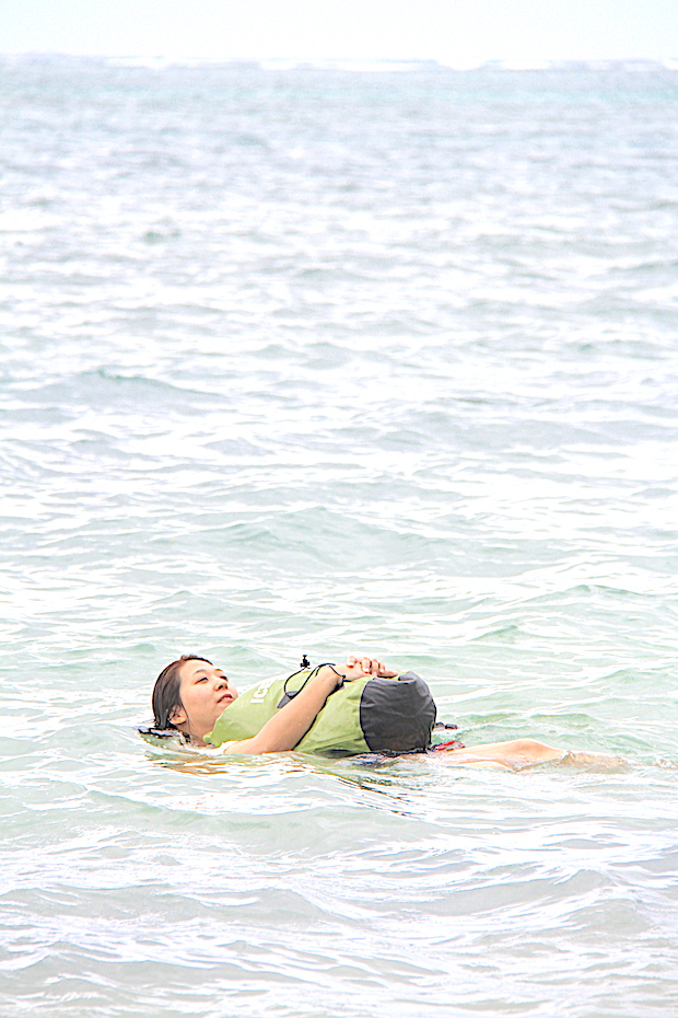 そしてまた、こんな使い方も。ともするとメーカーさんには怒られてしまいそうですが、海を渡渉したり、泳いだりするときには、浮き袋にもなってしまうのです! そもそもが空気の塊なので、浮力はもちろん申し分なし。でも、一点だけご注意を。水に浸かる前に、バルブがしっかりと閉じているかどうかだけは要確認です。シェルのあいだに水が入ってしまうと、プチ悲劇となりますので。