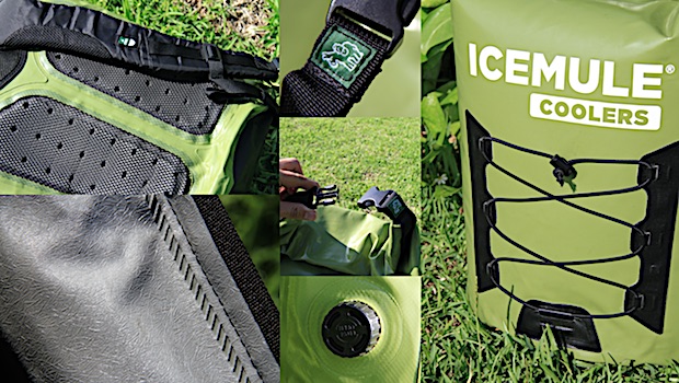 背面には通気性のいいパッドを配置。一般的なバックパックとほぼ同様の構造になっています。“MULE”とはロバのこと。アイスミュールは、氷を運ぶロバさんですね。前面にはバンジーコードを設け、バックルはドライバックと同じくクルクルと巻いてパチンと閉める方式。バルブはサーマレストのそれを思えばまちがいなしです。そして袋の内側は、いかにも熱が通りにくそうな加工を施した素材となっています