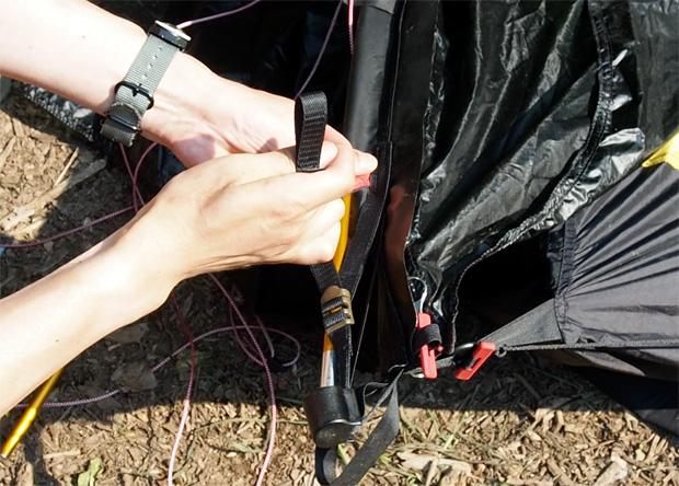 最初にポールを通す作業からスタート。ココで早くも重要Tipsがあり、ポールスリーブにポールを通した後、ストラップをしっかりと締めること。これを怠ると歪んだり美しく張れないらしいよ!