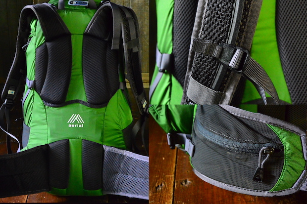 ザックの背面は必要最低限のパッドが配され、その立体的な隙間に空気の通り道ができて通気性を確保している。内部のパネルは立体形状で背面のフィット感はかなり高い。チェストストラップはワンタッチ式のタイプで上下の可動位置が広い。荷重を分散し、よりフィット感を高めるウエストハーネスには、ジッパー付きのポケットが配されている