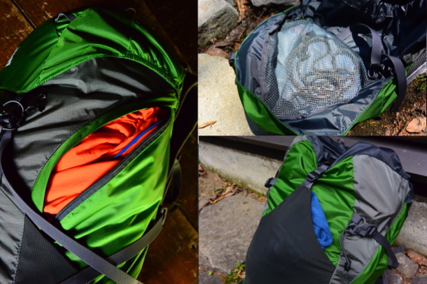 本体右横からアクセスできるサイドジッパーは、緩やかにカーブしているので、開口部が大きく開く。雨蓋内側のメッシュポケットはとても使いやすい。フロントとサイドには伸縮性のあるメッシュ素材のポケットがあり、雨具やボトルなどを簡易的に収納するのに便利だ