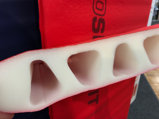 厚みは8㎝。レギュラー(183×51㎝、15,000円)の展開もあり。表地は軽量な30Dファブリックを採用。フォームに台形状・水平方向に肉抜きを施した「デルタコアフォーム」を入れることで、大きな厚みを出しつつ、支持力は維持。重量では約40%の軽量化に成功。