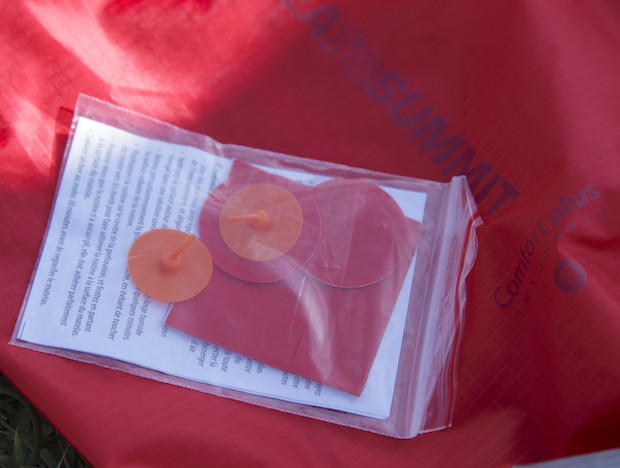 シートゥサミットのマットはみんな、パンク用のパッチとバルブの弁のスペアを標準装備しています。