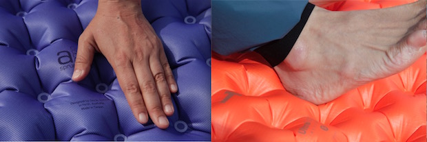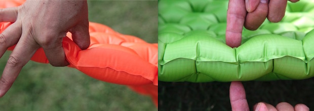 藤:あ、カタログ見ると、シートゥサミットでは、同じように見えても、触ってみると「気室が1層」と「気室はひとつだけど2層構造」「ふたつの独立した気室で2層」の3パターンがあるんですね。