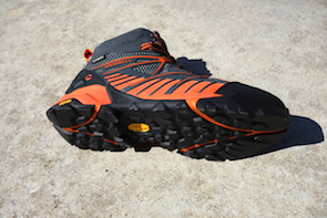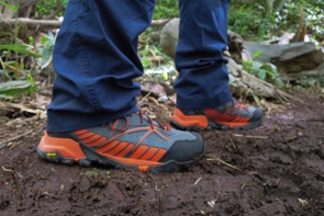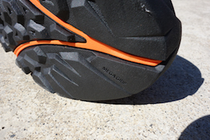 アウトソールに採用されている「MEGAGRIP(メガグリップ)」はビブラム社が開発したハイグリップコンパウンド。同行者が濡れた岩や湿った木に戸惑っているのを見て、そんなに滑る?と思ったことは一度や二度ではありませんでした