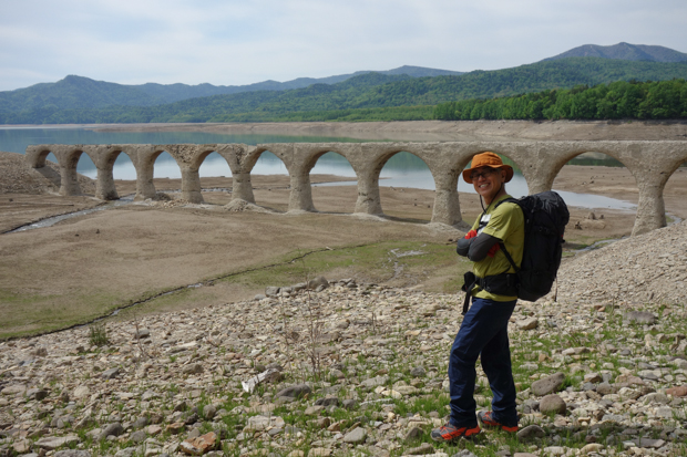 後ろに見えるのがタウシュベツ川橋梁。昔、ここは森の中でしたが、ダム湖建設にあたって樹を伐採。そのため妙に風通しのいい、どこかうら寂しい風景になっています。橋梁はダムの水量が増える夏には水に沈み、水量の減る冬になると全貌を現します。写真は6月下旬