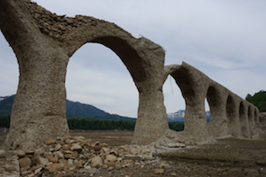現在の糠平湖東岸には、かつて鉄道が敷かれていました。森の中を走る鉄道は国鉄士幌線。帯広と十勝三股を結んでおり、途中のタウシュベツ川を超えるために架けられたのが「タウシュベツ川橋梁」だったというわけです。昭和30年には糠平ダムが建設されたことで士幌線は湖の西岸に架け替えとなり、この橋梁周辺は水に沈むことになりました。が、線路は取り除かれても橋梁はそのまま残され、それが今も「ダムの中の鉄道の橋」としてノスタルジーを誘っています。