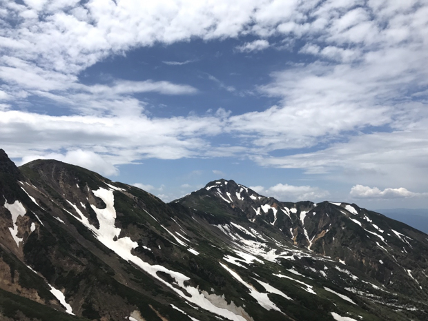 大きな雪渓を歩くと、足の裏がスーッと冷たくなります。最初は雪が染みているのかと勘違いしますが、これぞサラウンドの効果の一端。今まで味わったことのない通気性や透湿性がそう思わせるだけで、足はサラッサラでした。しかも、アウトソールの深いラグのおかげで、斜度の緩やかな雪渓なら難なく歩くことができます。が、油断は禁物。それを、このあとの縦走で思い知ることになるのでした