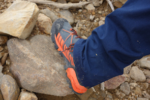 標高を上げていくと、次第に大きな石が目立ち始めます。飛び石のように岩から岩へと渡り歩くこともありますが、メガグリップの安定感は抜群。土踏まず部分が微妙にへこんだアウトソールは、足の裏全体でしっかり岩を捕まえることに役立っています