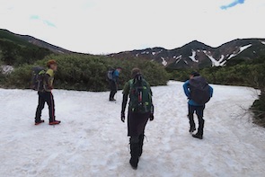 こんなこともあろうかと大雪縦走の必需品・アイゼンを装着しましたが、雪面が固いとアウトソールの柔らかさが仇となって上手く刃が刺さりません。誘ってくれたガイドのシューズは、アウトソールがしっかりとした、いわゆる山靴。アイゼン無しでもこの雪渓をスタスタ歩いていきます。なるほど、軽快な歩きで万能に見えたCAPRAですが、コンディションがハードになると力が及ばないこともあるようです。