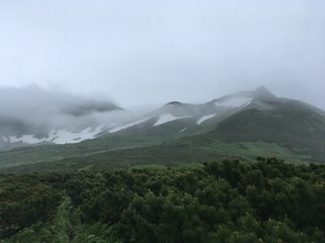 縦走1日目は美瑛岳登山口(828m)から美瑛富士避難小屋(1630m)を経てオプタテシケ山(2013m)を超え、双子池キャンプ指定地まで。前半はぬかるみと樹林帯の暑さに苦しみ、後半は岩場の急登に息が上がるという始末。しかも2つの大きな高気圧に覆われながらも、間に発生した小さな低気圧がジャストミートしてきて午後からお天気は下り坂。ガスに巻かれながら、まずは初日最大の難関、オプタテシケの雪渓下りに入ります。