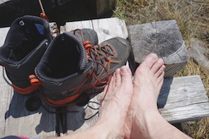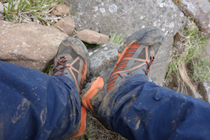 歩き方が下手なのでこんなに汚してしまったけれど、3日を経てなおソックスは泥汚れなし。じゅうぶんな高さのハイカットは、パンツの裾をかぶせているだけで泥やホコリの侵入をカットしてくれます。CAPRAのサポート力は絶大。この厳しいルートで20kg強のバックパックを背負って3日歩いても、大きな支障は感じませんでした