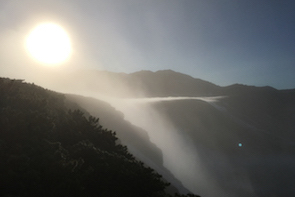 縦走3日目。前日までの水分をたっぷり吸った山からは雲がわき、滝雲となって流れ落ちていきます。太陽が、昨日までの雨さえも美しさの源なのだ、と思える心の余裕を引き出してくれます。今日は気持ちのいい稜線をメインに、行動時間12時間で20kmを歩きます