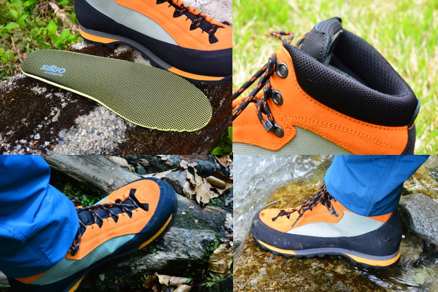 左上:付属のインソールは、厚み、形状ともにかなりいい。フットベッドはへたってきたら、すぐに新しいものに変える。右上:足首まわりのアンクルパッドが、後方にカットされているのでかなりアクティブな動きも可能だ。左下:濡れた木の根や赤土など滑りやすい場所でもグリップ力が強い。右下:濡れた岩やぬめりのある沢床の石でもかなりフリクション性能が高い