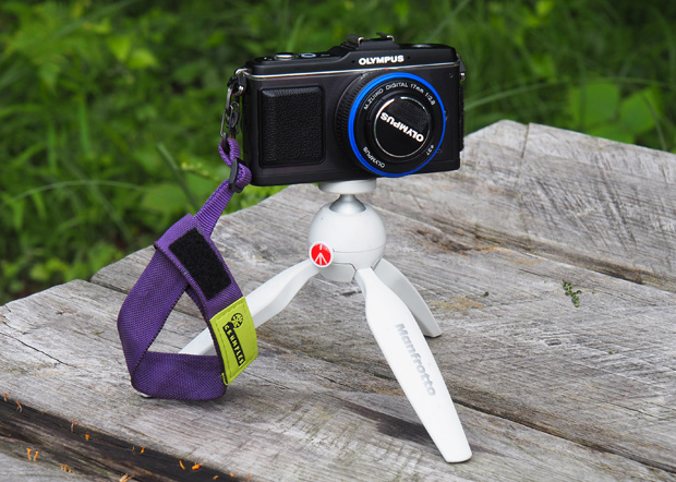 最近山でのミラーレス一眼カメラの携帯方法がコレ! テーブルトップ三脚とハンドストラップを取り付け、取り出しやすく、ブラブラしない『チェストストラップ固定方法』だ