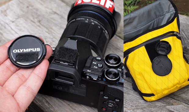 登山中にカメラに多いトラブルが、レンズキャップなどの付属パーツの紛失ではないだろうか? ボクはレンズキャップとフラッシュを取り付ける部分のカバーにはベルクロテープを貼り付けている。レンズキャップを外した時はこの部分にペタリと貼り付けている、もしくはカメラバッグのベルクロ部分。カバーは金属パーツごとベルクロテープを貼り付けているのでまず無くさない。アイカップ部分も無くしたことがあるので強めの両面テープを細く貼り付け、取れないようにしている。
