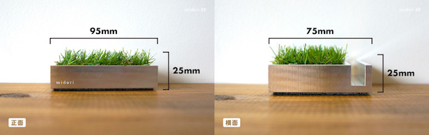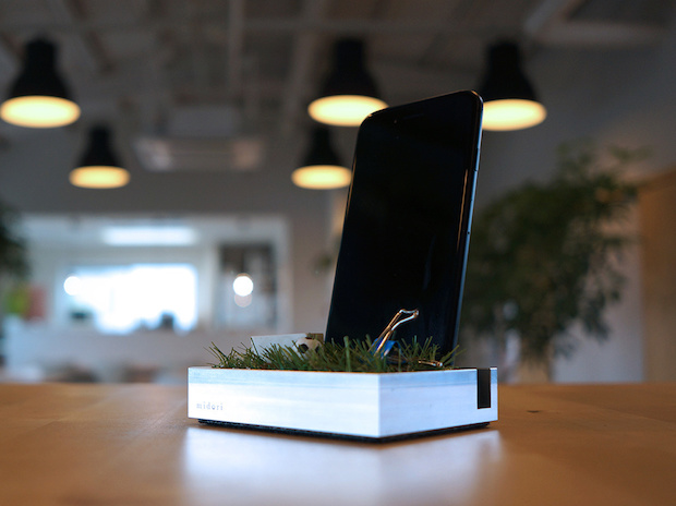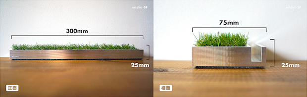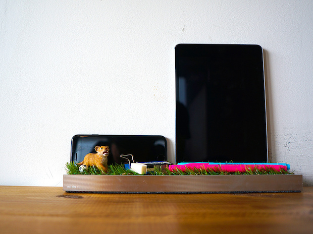 アルミ材から削り出した基台にリアルな人工芝を植え付け、スマートフォンやタブレットのスタンドを備えたのが「midori-SE」と「midori-SF」です。