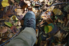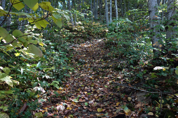 さて早速歩きに行ったのは、家の裏にある標高500mほどの里山。北海道のことですからすでに紅葉が始まっており、登山道は落ち葉の絨毯です。そんな中を登ってみると、地面を蹴る際にアウトソールの反発力が心地いい! 足がスッと前に出る軽快さを感じます。この日は3時間ほど歩きましたが、初めて履いた靴なのに足馴染みは良好。どこか一箇所が足に当たるということもなく、非常に快適に歩くことができました。