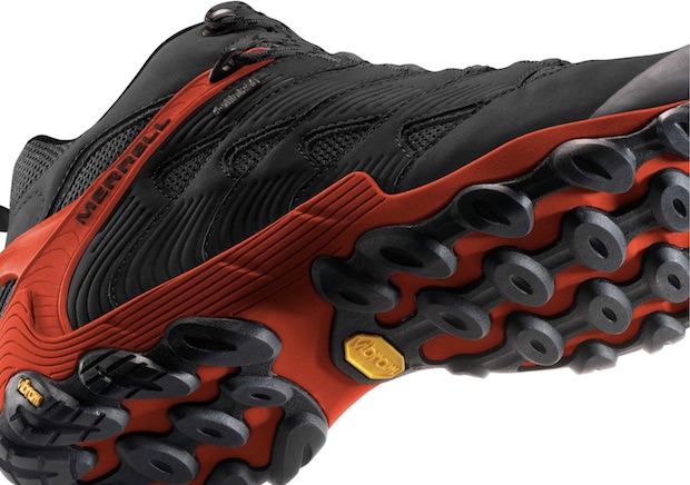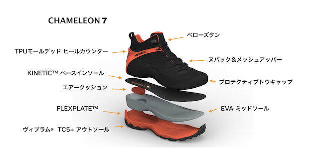 図の赤いパーツが「フレックスプレート」。頑丈なパーツなので、ほぼそのままアウトソールとして機能しています。この「フレックスプレート」の特性を活かすことができたからこそ、CHAMELEON 7は最新の軽さを身につけることができました