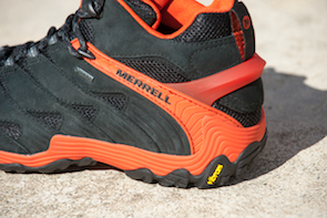 MERRELLのロゴを載せたラインや、かかとをしっかりサポートするヒールカウンター、そしてGORE-TEX®のロゴ。このかかと周りこそ、CHAMELEON 7の顔です