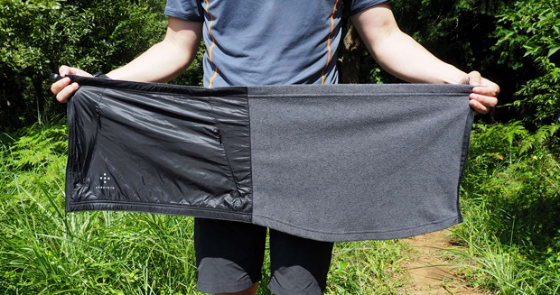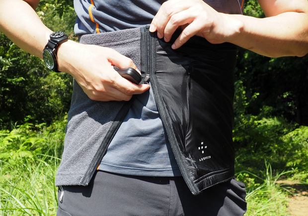 広げるとこんな感じ。体に当たる部分は、通気性の高そうな薄手のマイクロフリースでできている。フロントには薄手のナイロン素材を張り、風に吹かれても急激に冷えることはなさそうだ。この部分はジッパー式のカンガルーポケットになっている。