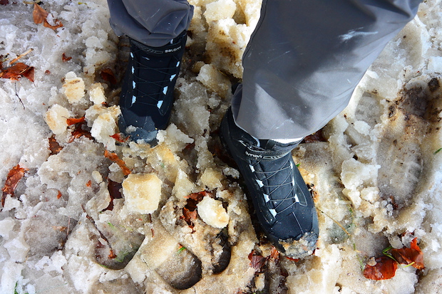 グリップ力という点ではソールのパターンと硬さから見ても登坂能力や前への歩行推進能力にはとても優れているのだが、ふとしたとき、斜面に対して横を向き、平行に足を置いたときや、逆ハの字で斜面を登るときなど、横方向へとずれることが何回かあった。これはタウンユースではあまり想定されることのない力の方向性でもあり、あまり気にしなくてもいいかもしれないが、ハードなアウトドアシーンでは、無意識な足の運びには注意をしたい。