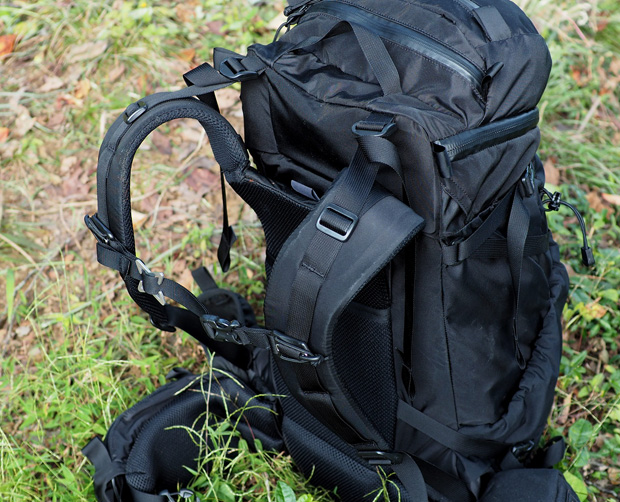 ショルダーハーネスも薄く幅広のモノに変更されている。肩のスタビライザーは残っているので調整が必要、引きすぎると頭の動きを制限し、引かないと荷物が振られる。以前はこのような調整が腰にもあったが、ウエストのスタビライザーは省略し、ウエストベルトを引くだけでスタビライザー効果がでるようになっている。