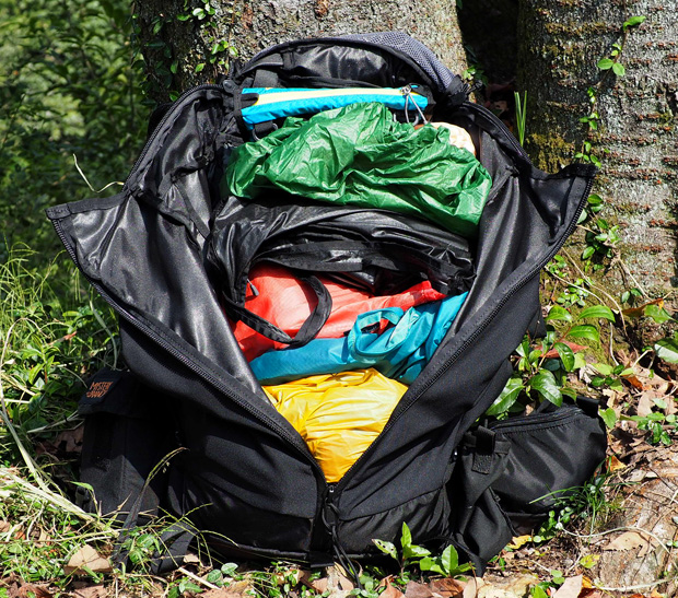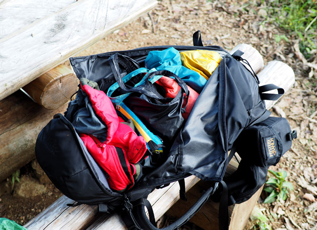 やっぱりY字に開く3ジップは便利だ! メイン気室がフルに開き、一度使い始めるとやめられない。下に入れた荷物も簡単に引っ張り出すことができるので、几帳面なパッキングも不要だ。ボクは防寒着は黄色、雨具は青色、緊急用品は赤色、着替えは黒色、食料は緑色と、色で荷物を分けて入れている。