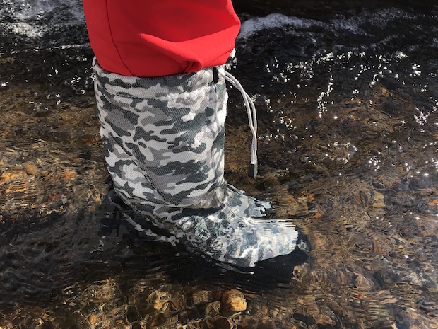 ファーストインプレッションで抱いた懸念材料は、湿雪や雨がアッパーから染み込んでこないのか? というスノーブーツには不可欠な防水性でした。いくらあたたかくても、いくら歩きやすくても、水が染みてきたらスノーブーツとしての意味がありません。そこで、いざ実験。水深20㎝ほどの水路にドボンと入って、約20秒足踏みしてみました。ブーツ内の結露で内側はしっとりとするものの、1滴たりとも水が内部へしみてくることはありませんでした。