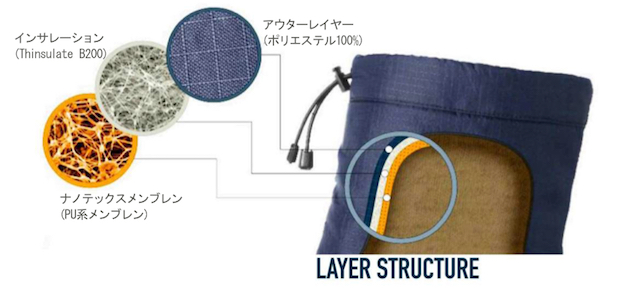 アッパーは、保温性と防水性を高めた3層構造。アウターレイヤーには、ポリエステル100%の防水性、防風性に優れた生地を採用しています。インサレーションには、3M/Thinsulate B200。インナーレイヤーには、吸湿速乾性に優れ、肌触りのいいナノテックスメンブレン。