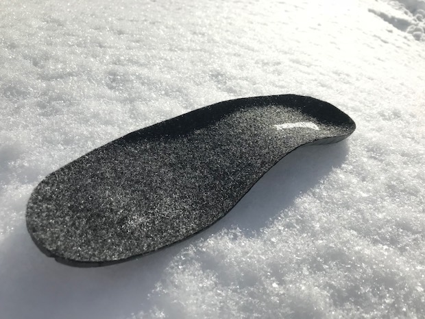 この縞模様のふたつのブロックが「アイスロック」。体重のかかるカカトや親指の付け根などに配置されています。滑る原因となる氷面の水をスポンジのように吸い取り、確実にグリップしてくれるスグレモノです。