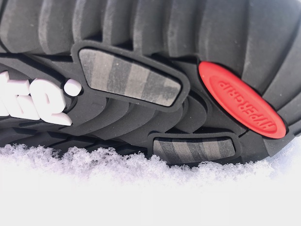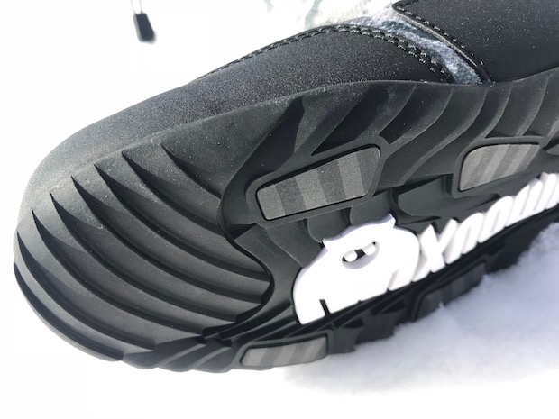 スノーメイトの最大の特徴が、この2種類のソールパターン。波状の凹凸部分が「スノーロック」=雪を噛んで、踏み込んだ力を推進力へとかえる作用があります。また、「アイスロック」=凍結した路面でも滑りにくい特殊素材も6カ所に配置。