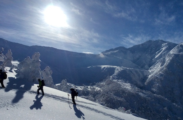 こちらは厳冬期である2月中旬の月山。バックカントリーへの出発前はさすがに寒いです。が、斜面を歩き始め運動量がグンと増えてくるとよさを存分に発揮。篭った汗がどんどん抜けハイクアップが非常にラクに行なえました。フィールドの気温が随分と低いけれど、運動量がかなり多いと予想できるときは「スカイポイントフードッドジャケット」はベストチョイスとなります。
