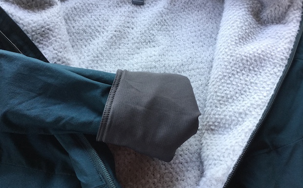 ちなみに、女性モデルはこのように身頃とフードの裏面全体に「アルファダイレクト」が敷かれています(メンズモデル「エイサームフーデッドジャケット」は、肩と脇の部分には毛足の長いフリースを配置)。