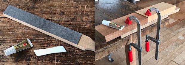 接着剤で棒と革を接着して、クランプで挟み込んで固まるまで圧着。「接着剤が固まるのも待てないよ!」という気が短めの人は、接着剤ではなく両面テープで固定してもいい。