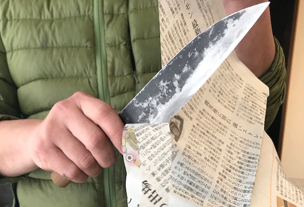 ストロップをかけると刃先の曇りが取れて、鏡面仕上げのような質感になる。それでは、手近な紙を切ってみよう! (友人宅の包丁で撮り忘れちゃったから家にあった種子包丁に選手交代。もちろんこれにもストロップをかけた)