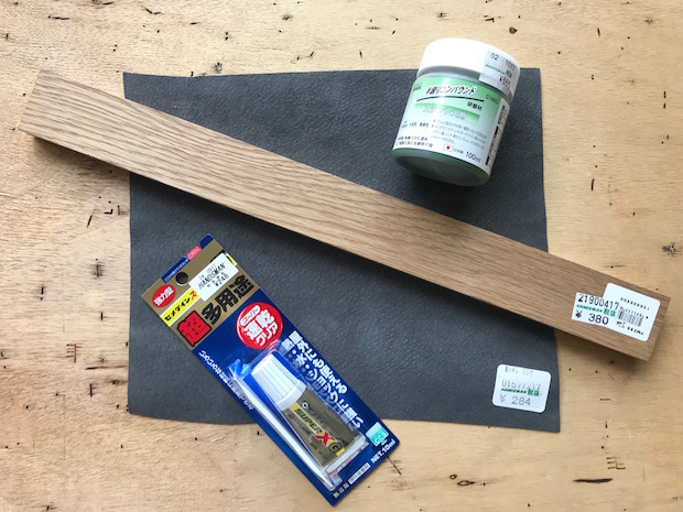 用意した材料一式。全長30cm程度の木の棒、本革の端切れ、接着剤、ステンレス用半練りコンパウンド。どれもホームセンターで購入できる。本革はスエード面の毛足が長すぎず(短すぎもよくない)、密で揃っているものがおすすめ(写真の革はちょっと粗悪)。コンパウンドが売り場になければ、金属磨き剤の「ピカール」でも代用できる。今回は見た目重視でちょっといい木を使ったが、面がフラットなら値も付かないような棒でも十分に用をなす。