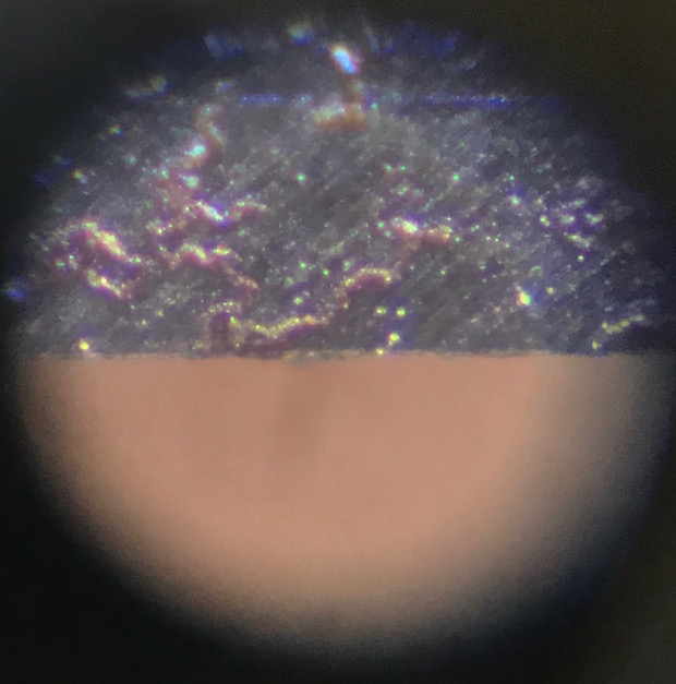 研いだまま放置されていたので、刃先をクローズアップすると錆による虫食い状の腐食が見える(100倍)。