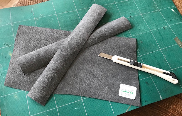 続けて、木の棒の幅広の面に合わせて、革を短冊状に切り出す。