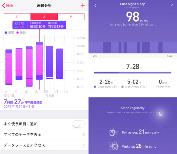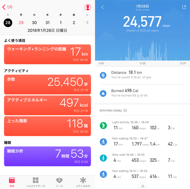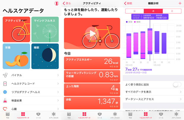 英語の専用アプリもあるが、面倒な設定なしでiPhoneにインストールされていた「ヘルスケア」とも連動して動く。記録される項目はアクティビティと睡眠みたいだ。