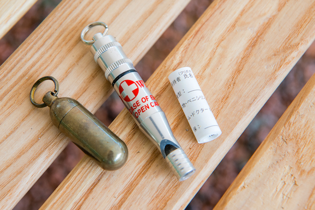 1986年から32年間、変わらずに販売し続けている「SOSカプセル」(左)と「オリジナルIDホイッスル」